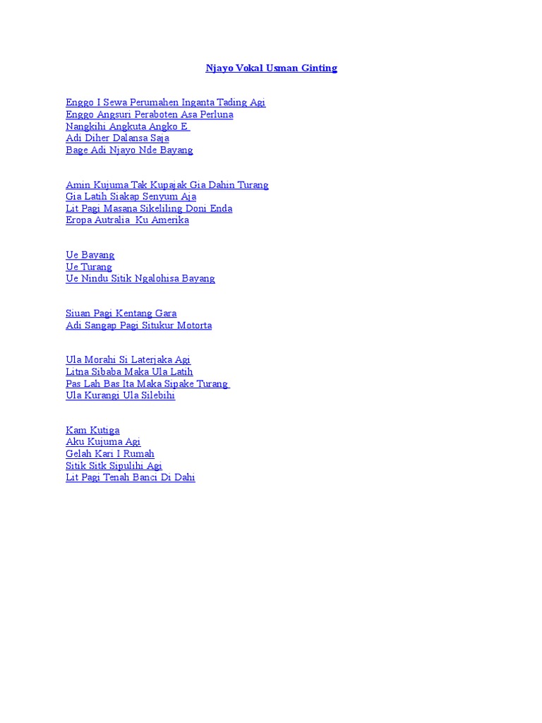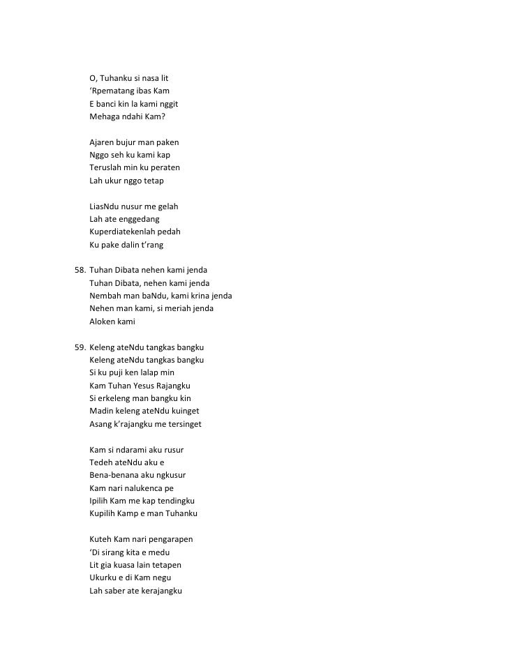 Keriahen lalap lit Kap man kalak si enggit. Karo 11 August 2007 Usman Ginting 3 Comments. Kuteh Kam nari pengarapen Di sirang kita e medu Lit gia kuasa lain tetapen Ukurku e di Kam negu Lah saber ate kerajangku Kuinget lalaplah Tuhanku 4.