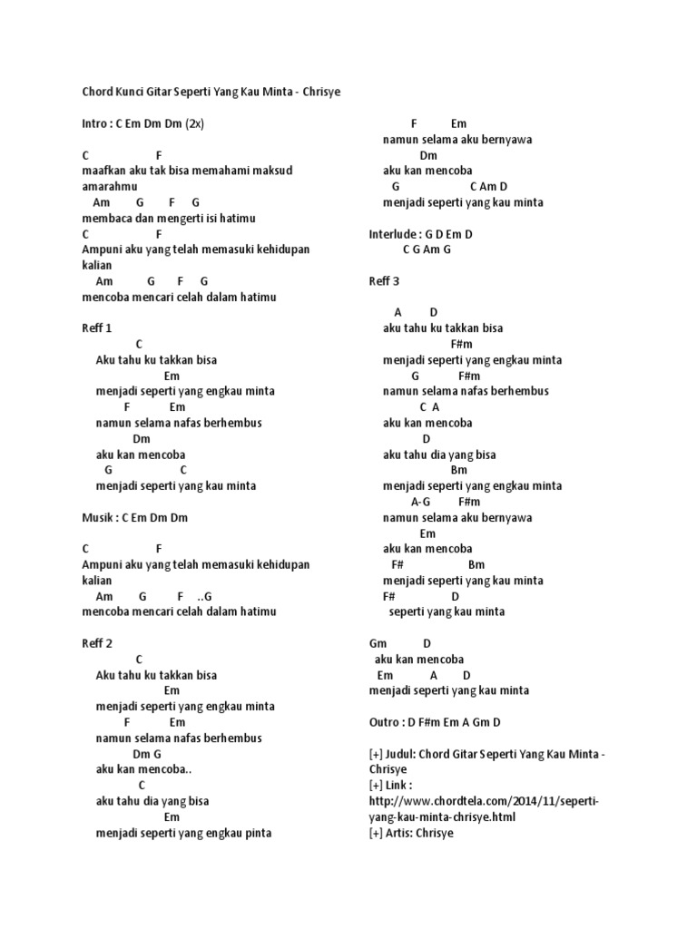F G C G Reff. G D Em D C G Am D Verse G D Em D C G Pernah ada rasa cinta antara kita Am D Kini tinggal kenangan G D Em D Ingin ku lupakan semua tentang dirimu C G Am D Namun tak lagi kan seperti dirimu G Oh bintangku Chorus G D Em D Jauh kau pergi meninggalkan diriku C G Am D Di sini aku merindukan dirimu G D Em D Kini ku coba. G C G wes iso gawe bubrah donyoku.